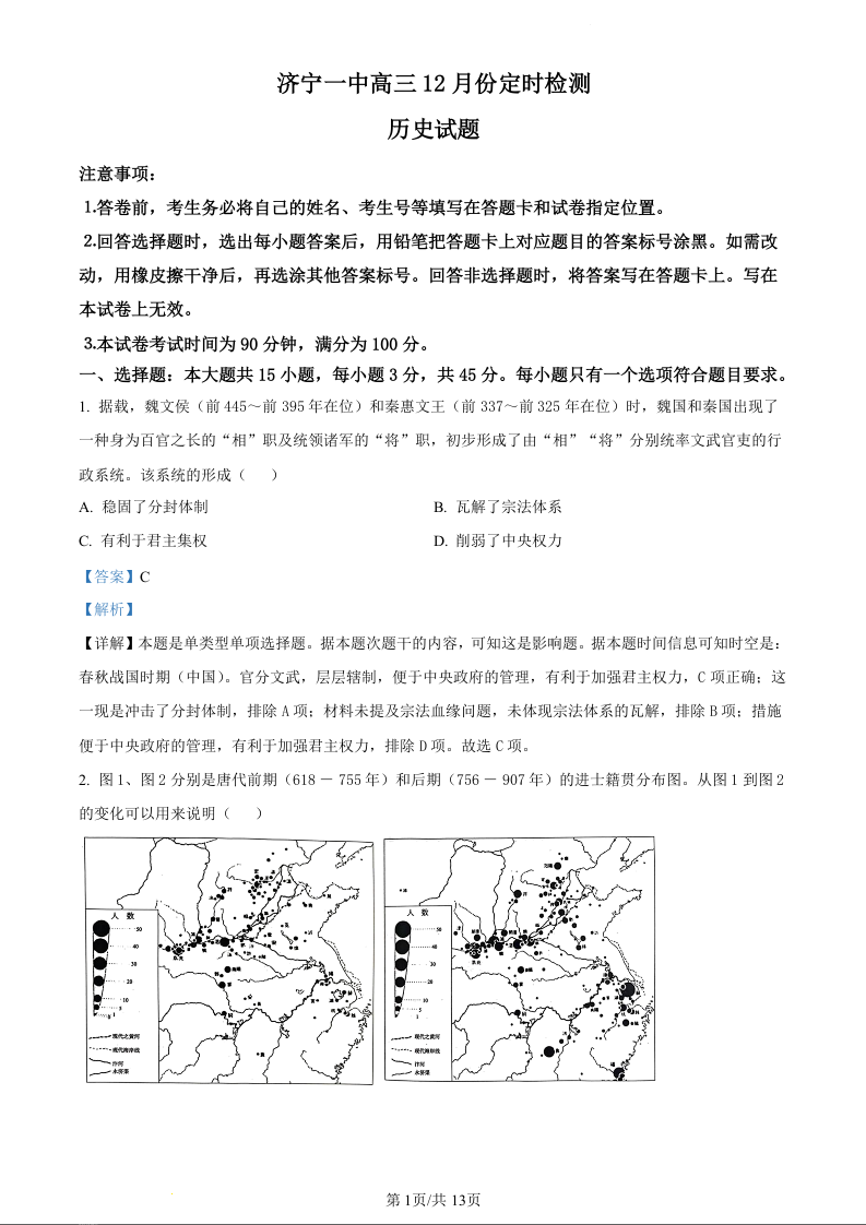 山东省济宁市第一中学2024届高三上学期12月月考历史(精品解析版)