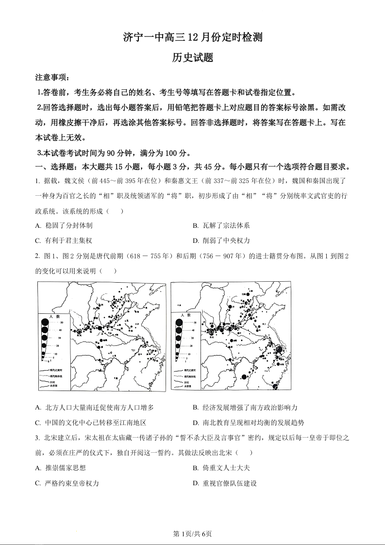 山东省济宁市第一中学2024届高三上学期12月月考历史(原卷版)