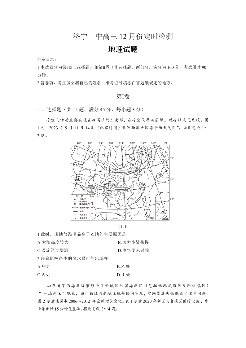 山东省济宁市第一中学2024届高三上学期12月月考地理