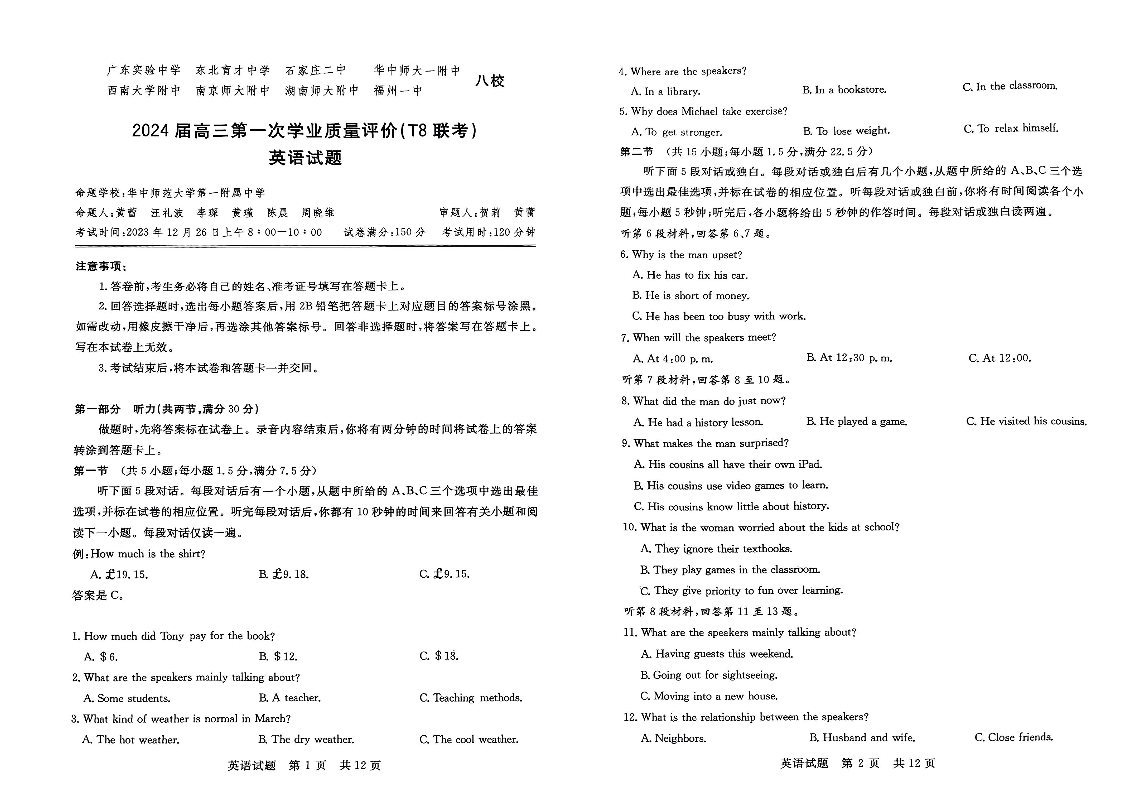 2024届高三八省联考第一次学业质量评价(T8联考)英语