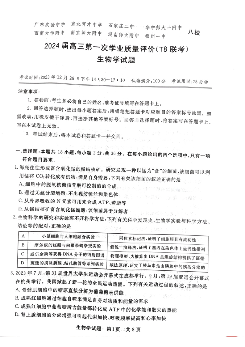 2024届高三八省联考第一次学业质量评价(T8联考)生物+答案