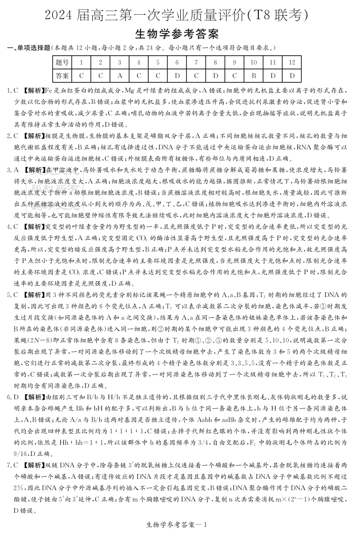 2024届高三八省联考第一次学业质量评价(T8联考)生物答案