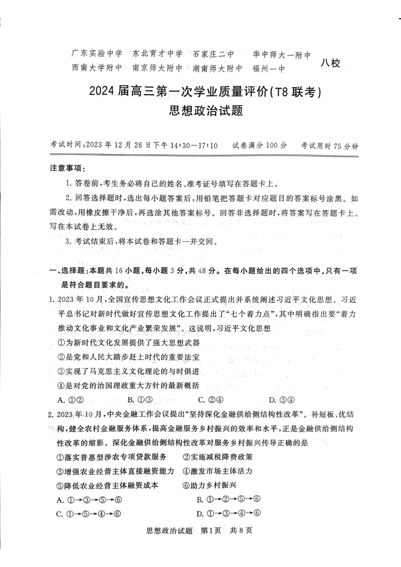 2024届高三八省联考第一次学业质量评价(T8联考)政治