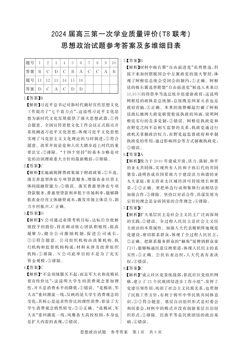 2024届高三八省联考第一次学业质量评价(T8联考)政治答案