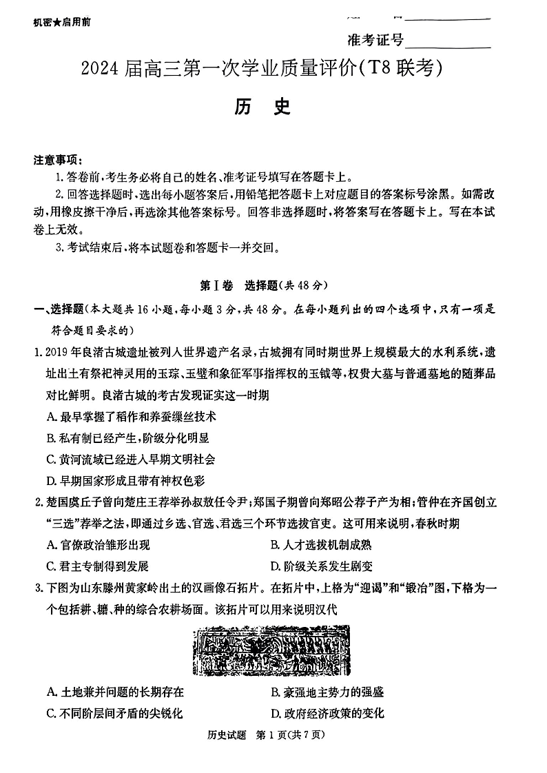 2024届高三八省联考第一次学业质量评价(T8联考)历史