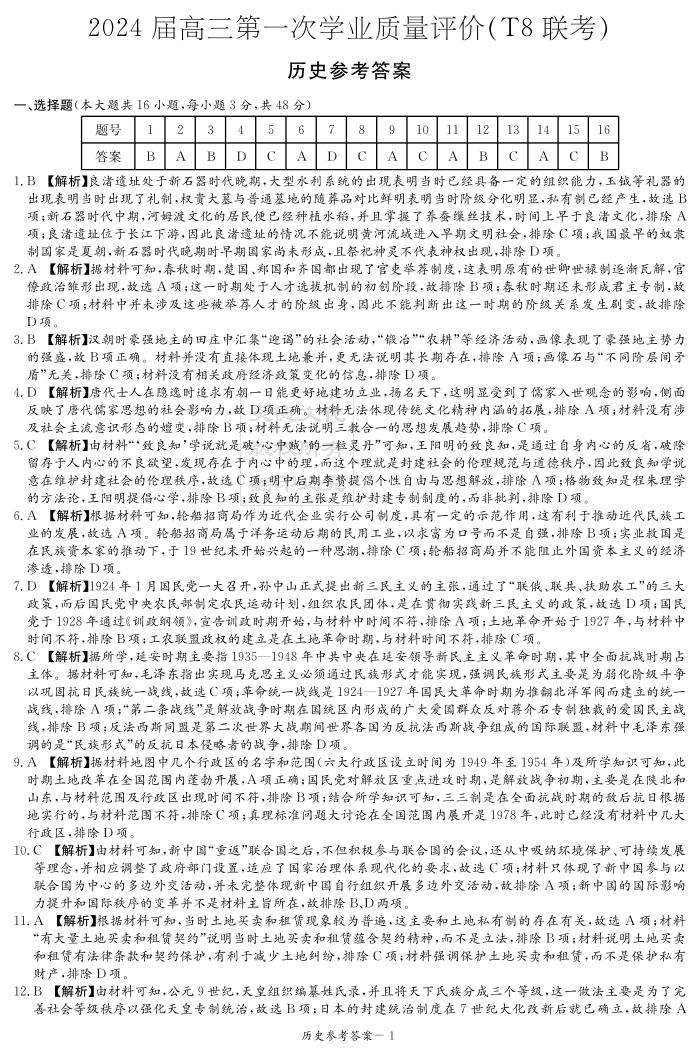 2024届高三八省联考第一次学业质量评价(T8联考)历史答案