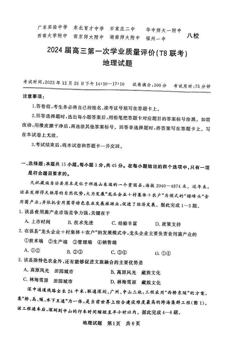 2024届高三八省联考第一次学业质量评价(T8联考)地理+答案
