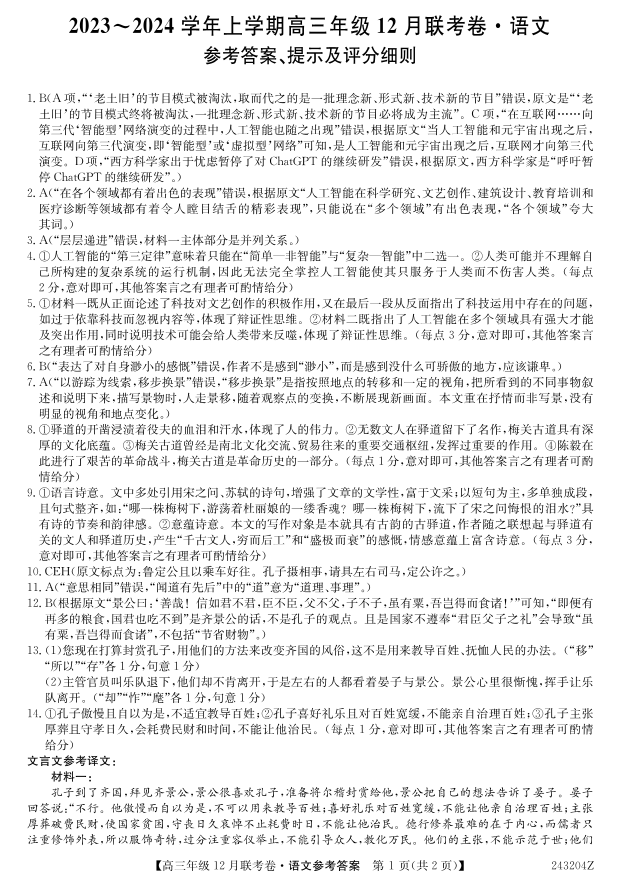 辽宁省朝阳市建平县2024届高三上学期12月联考语文答案