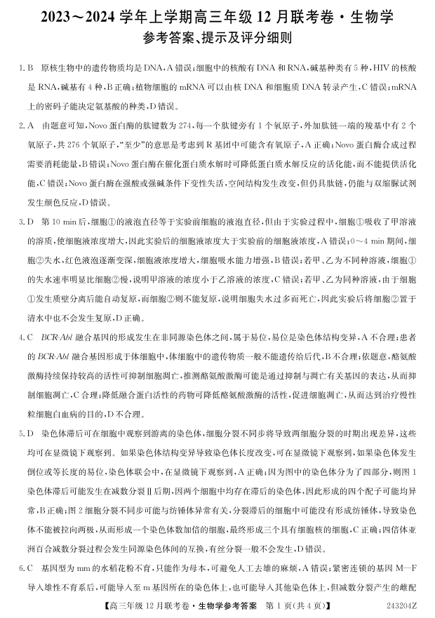 辽宁省朝阳市建平县2024届高三上学期12月联考生物答案