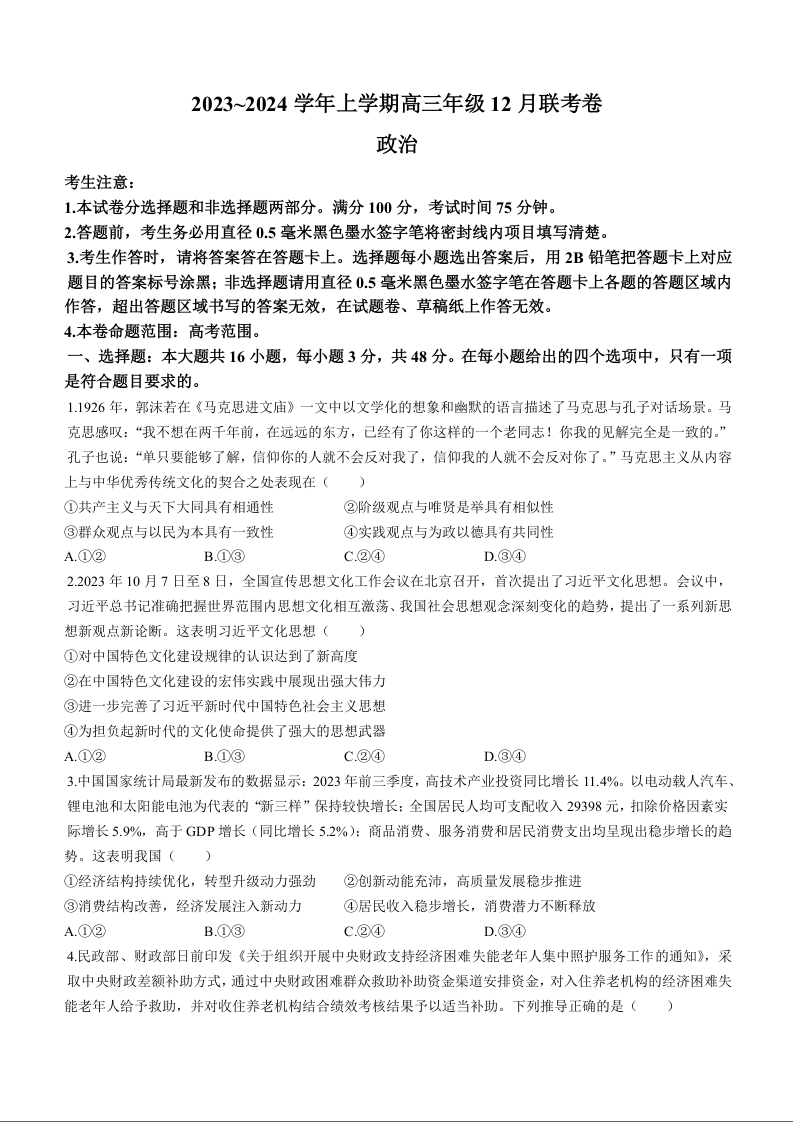 辽宁省朝阳市建平县2024届高三上学期12月联考政治+答案