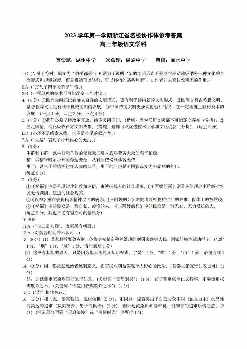浙江省名校协作体2024届高三上学期返校联考语文答案