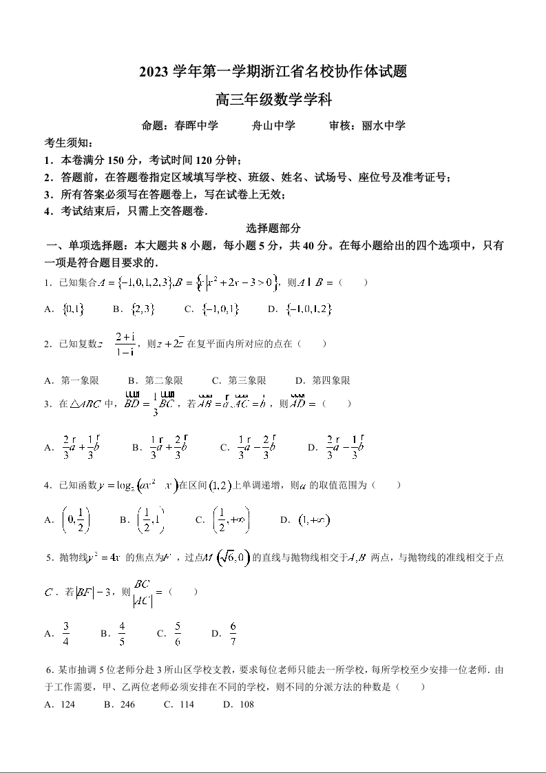 浙江省名校协作体2024届高三上学期返校联考数学+答案