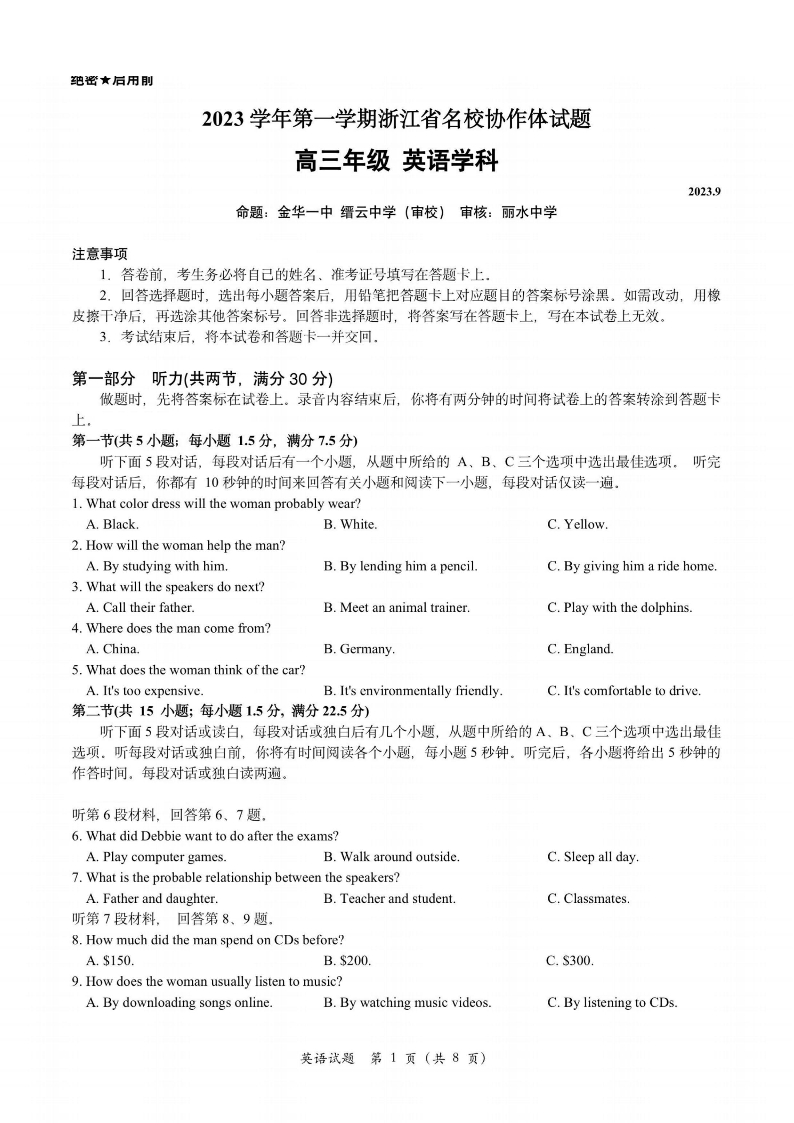 浙江省名校协作体2024届高三上学期返校联考英语