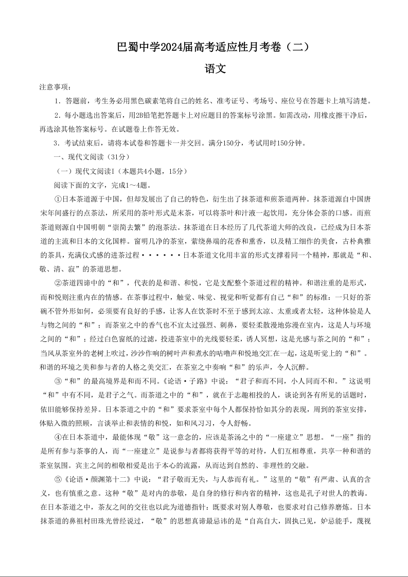 重庆市巴蜀中学2024届高考适应性月考(二)语文+答案