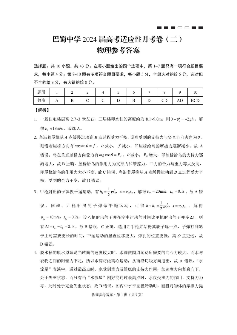 重庆市巴蜀中学2024届高考适应性月考(二)物理答案