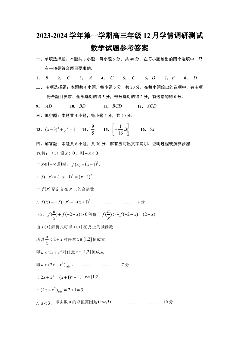 江苏省扬州市高邮市2024届高三上学期12月月考数学答案