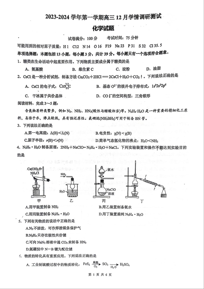 江苏省扬州市高邮市2024届高三上学期12月月考化学+答案