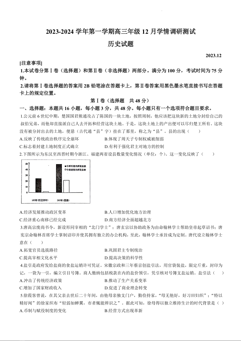 江苏省扬州市高邮市2024届高三上学期12月月考历史+答案