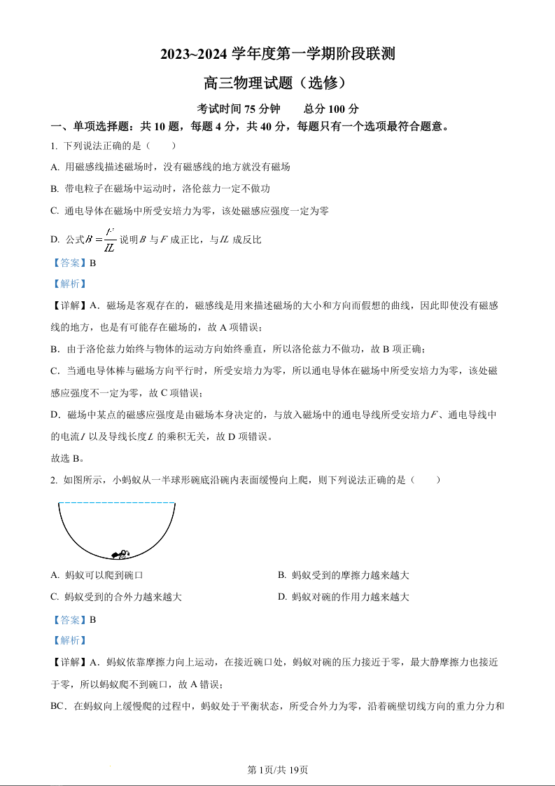 江苏省五市十一校2024届高三上学期12月阶段联测物理(精品解析版)