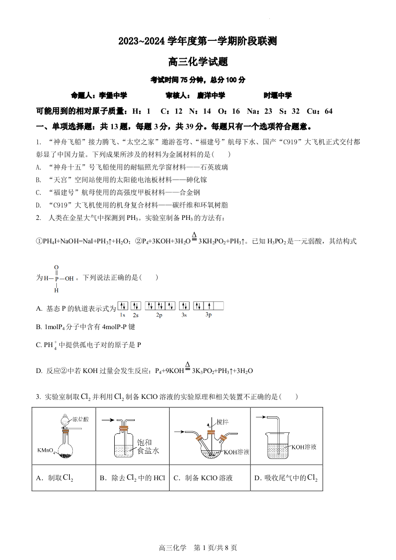 江苏省五市十一校2024届高三上学期12月阶段联测化学