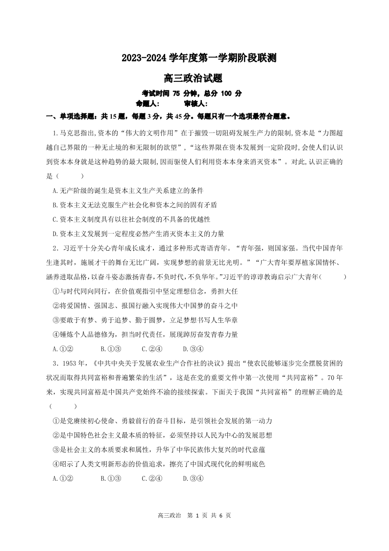 江苏省五市十一校2024届高三上学期12月阶段联测政治