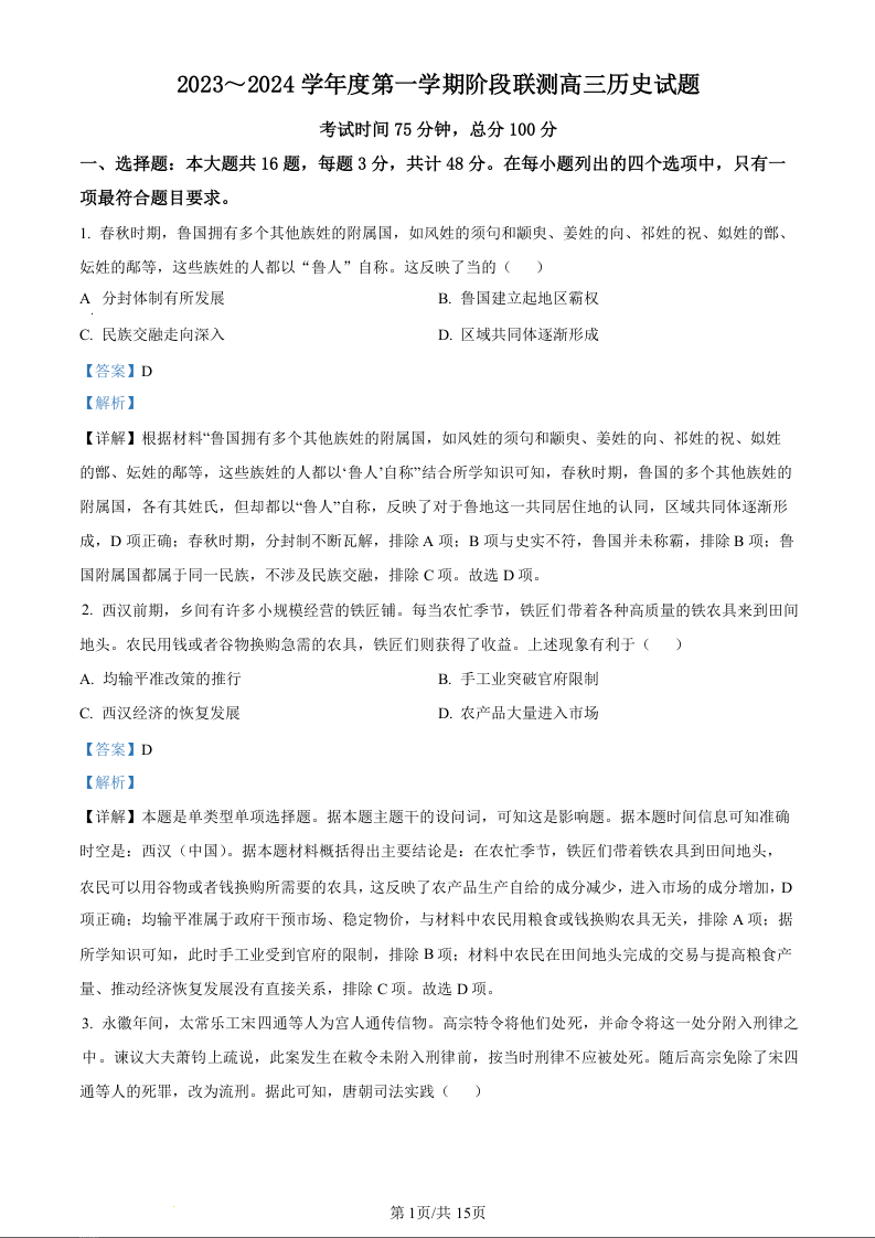 江苏省五市十一校2024届高三上学期12月阶段联测历史(精品解析版)