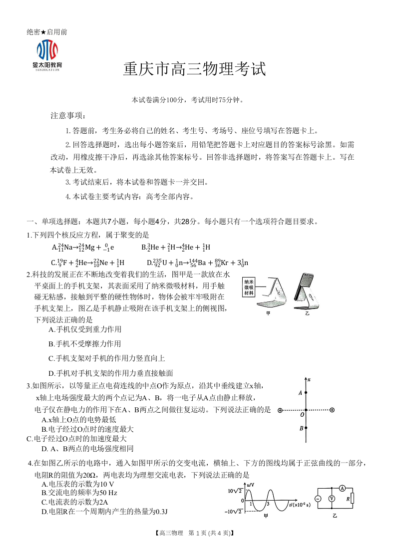 重庆好教育联盟2024届高三金太阳9月开学联考物理