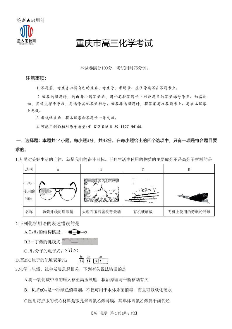 重庆好教育联盟2024届高三金太阳9月开学联考化学