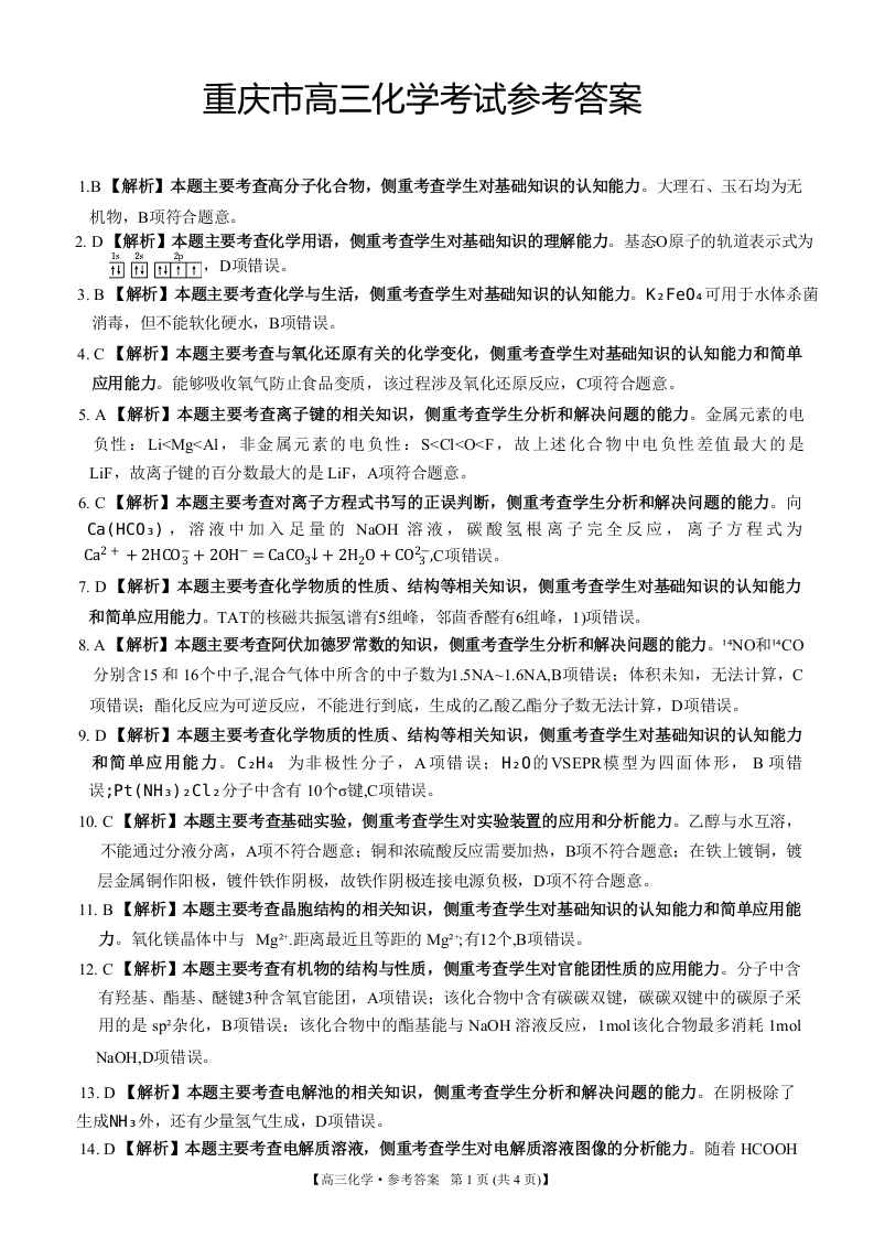 重庆好教育联盟2024届高三金太阳9月开学联考化学答案