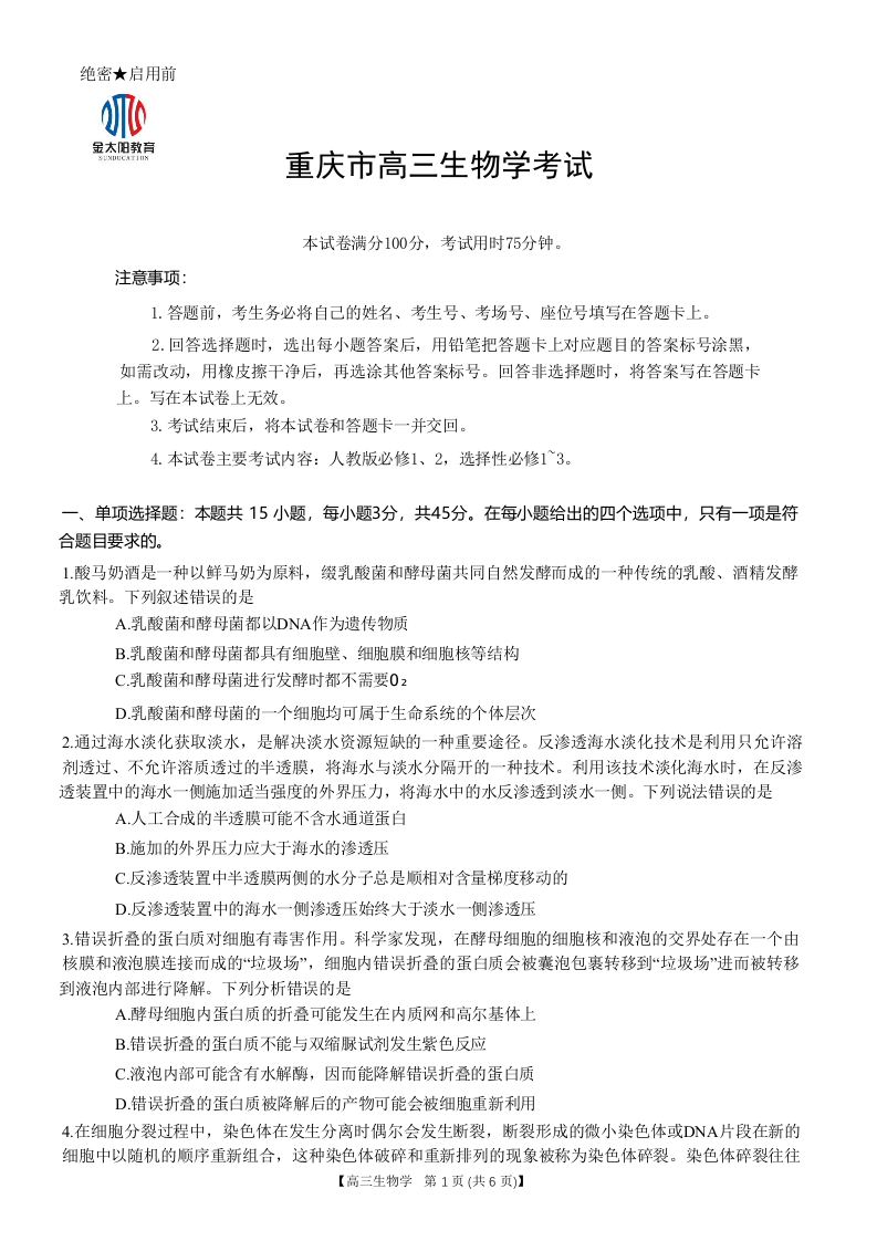 重庆好教育联盟2024届高三金太阳9月开学联考生物