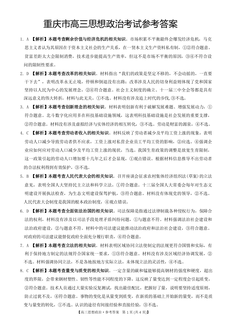 重庆好教育联盟2024届高三金太阳9月开学联考政治答案