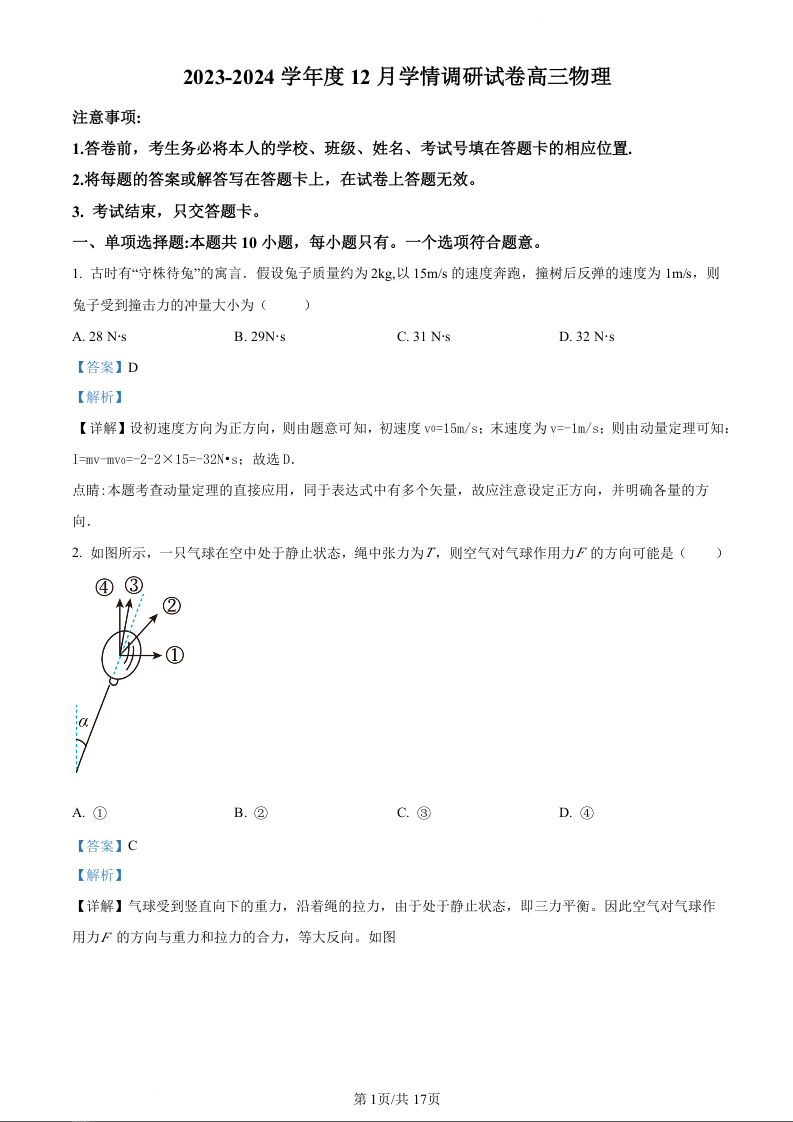 江苏省无锡市四校2024届高三上学期12月学情调研试卷物理(精品解析版)