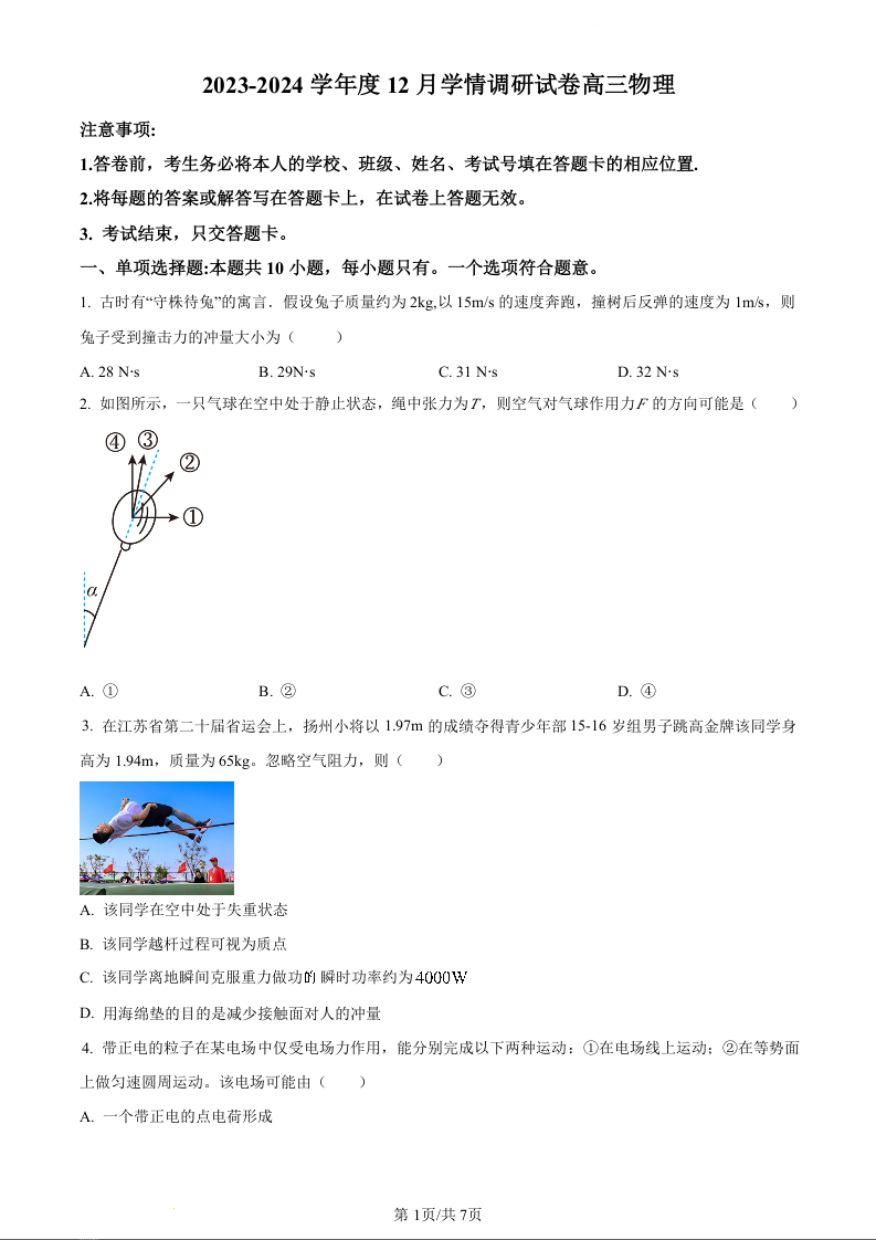 江苏省无锡市四校2024届高三上学期12月学情调研试卷物理(原卷版)