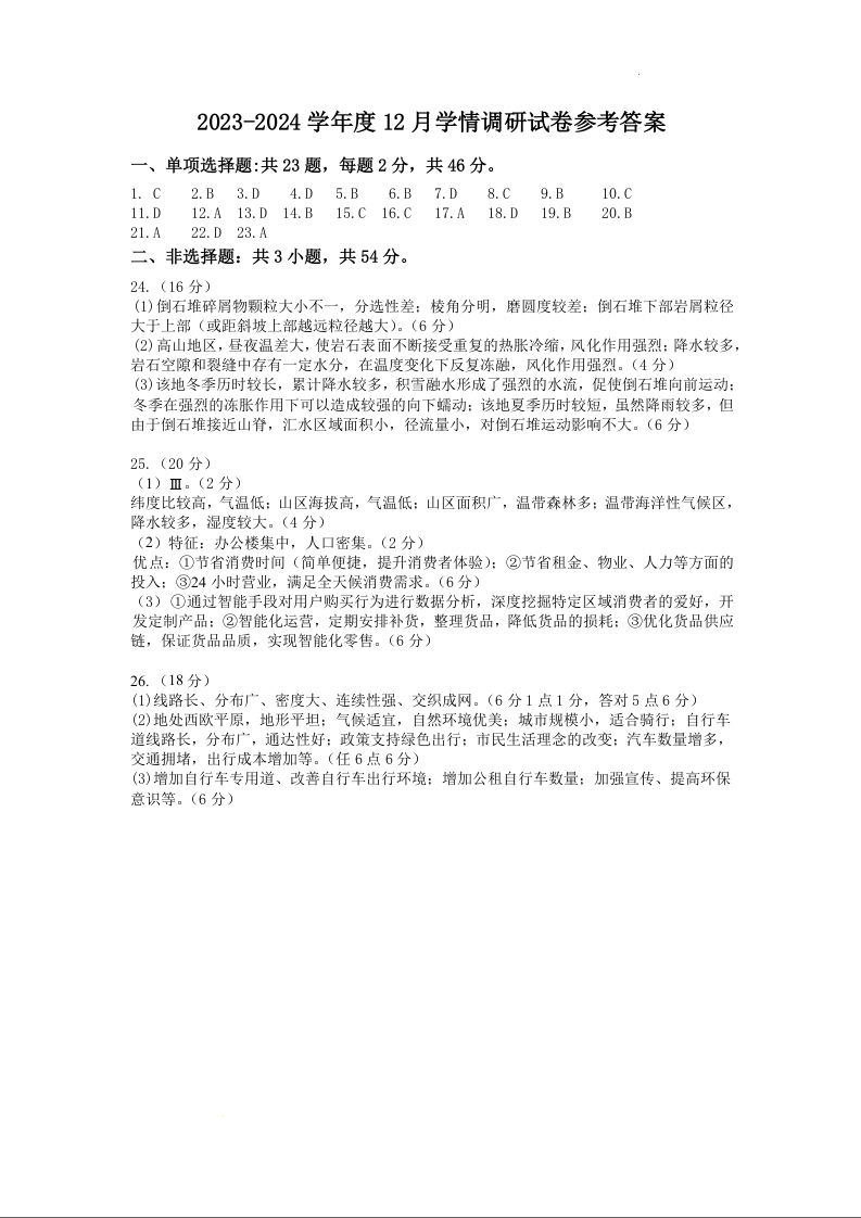 江苏省无锡市四校2024届高三上学期12月学情调研试卷地理答案