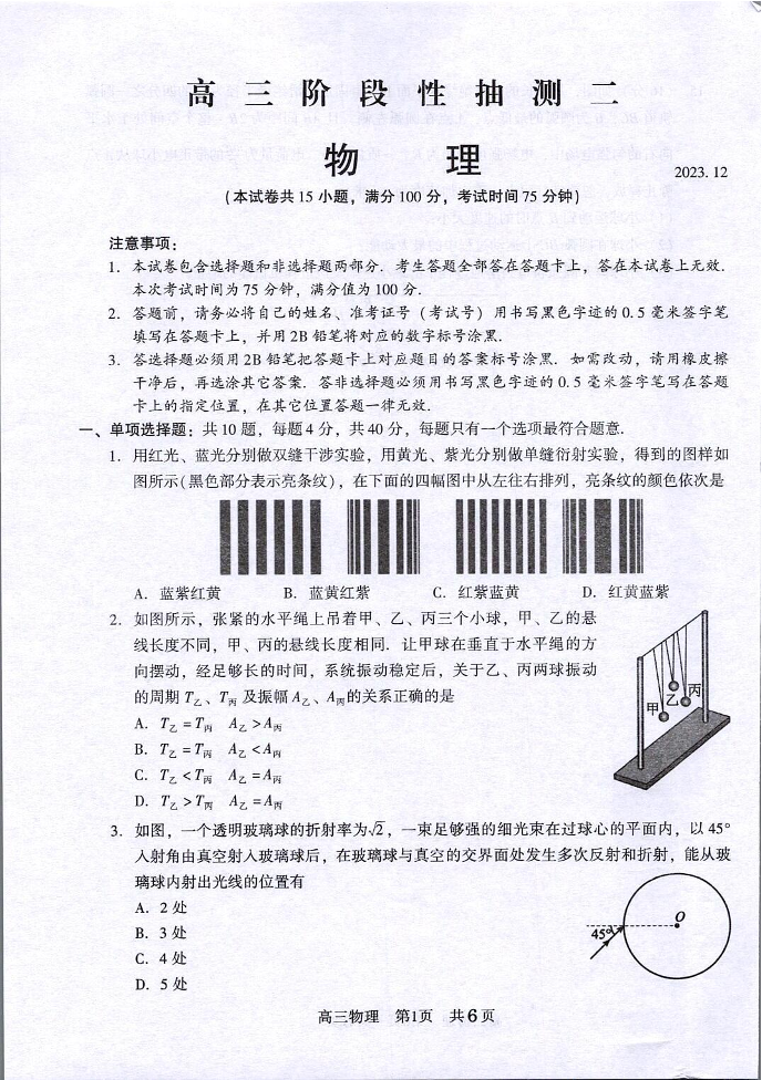 江苏省常熟市2024届高三上学期阶段性抽测二物理+答案