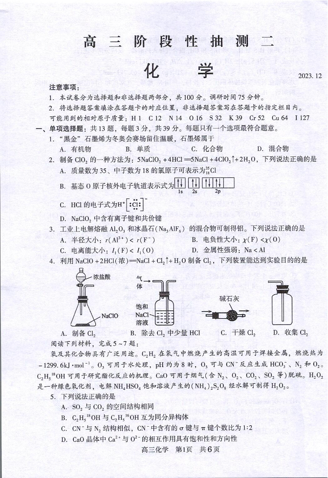 江苏省常熟市2024届高三上学期阶段性抽测二化学+答案
