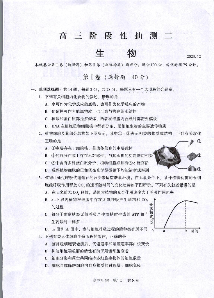 江苏省常熟市2024届高三上学期阶段性抽测二生物+答案