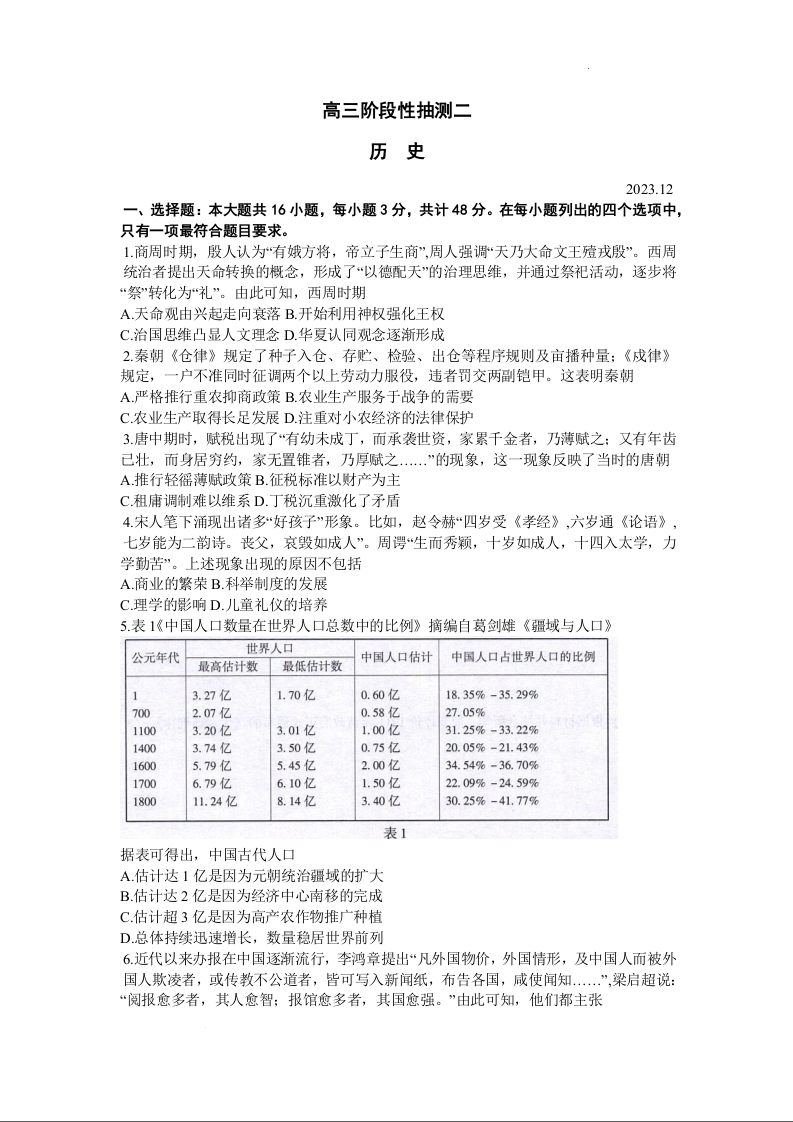 江苏省常熟市2024届高三上学期阶段性抽测二历史+答案