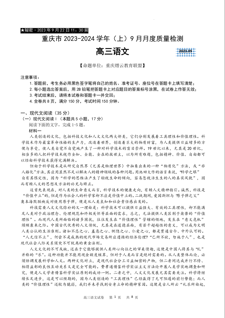 重庆市缙云联盟2024届高三上学期9月联考语文