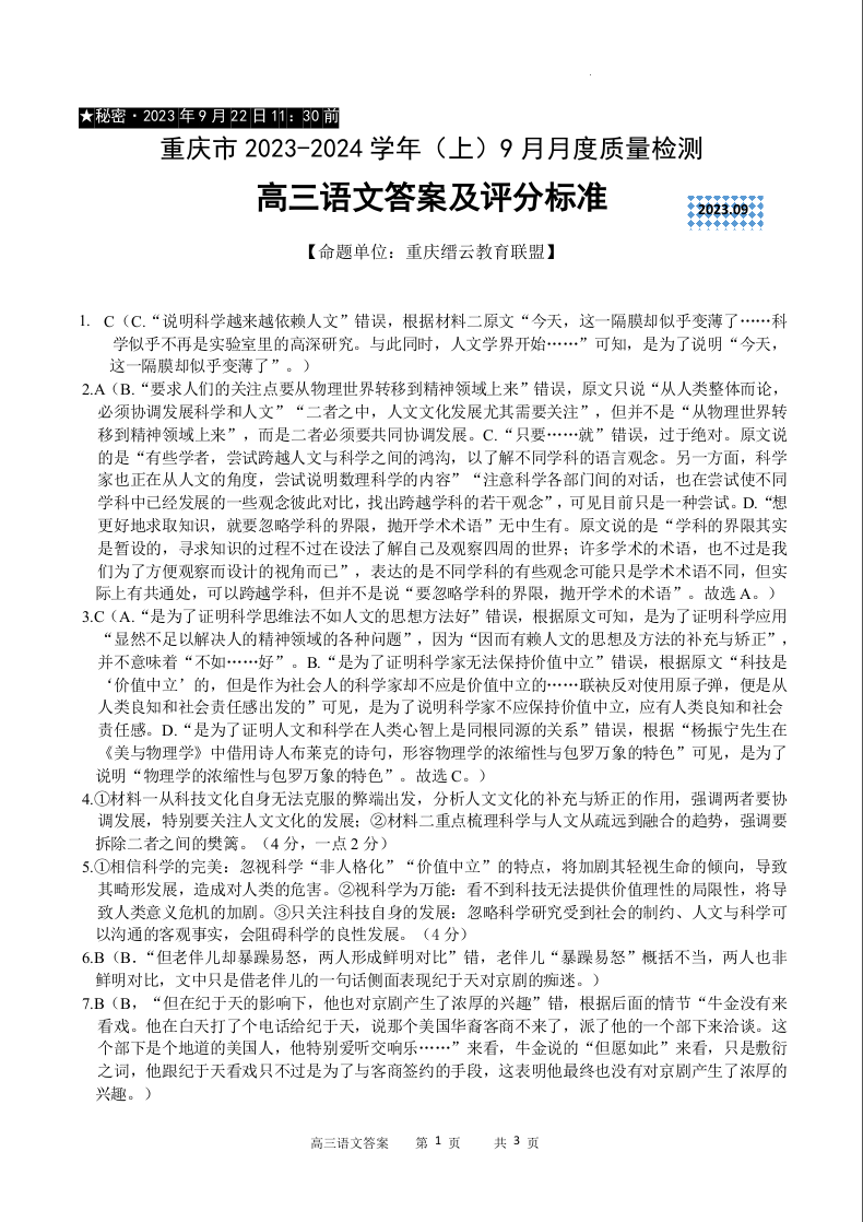 重庆市缙云联盟2024届高三上学期9月联考语文答案