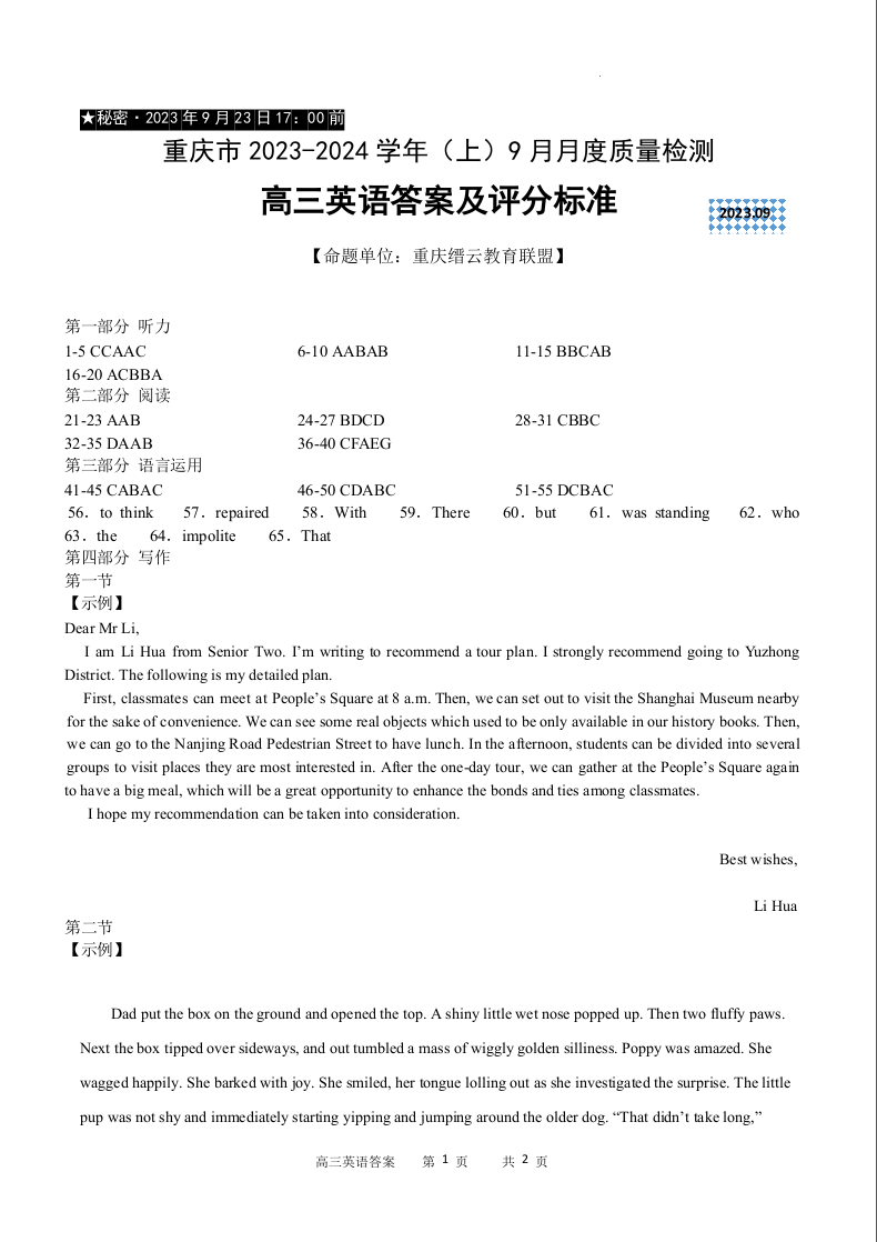 重庆市缙云联盟2024届高三上学期9月联考英语答案