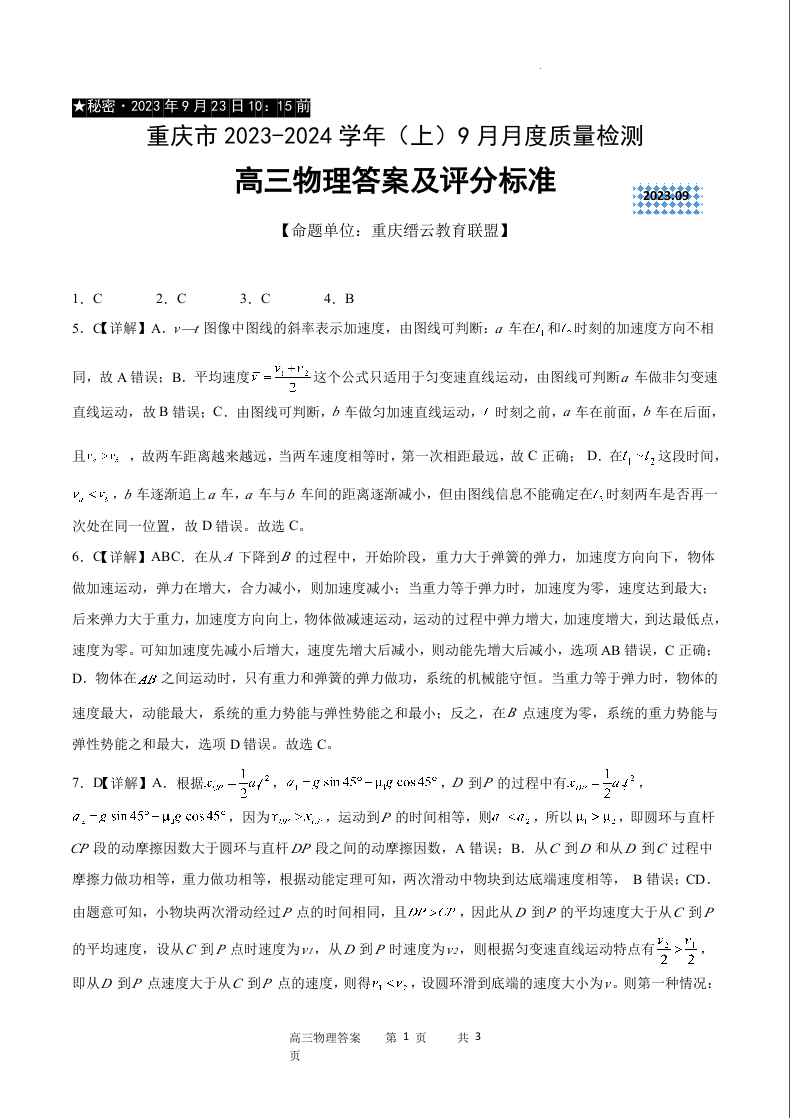 重庆市缙云联盟2024届高三上学期9月联考物理答案