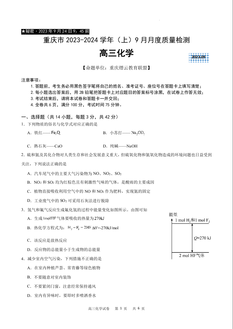 重庆市缙云联盟2024届高三上学期9月联考化学