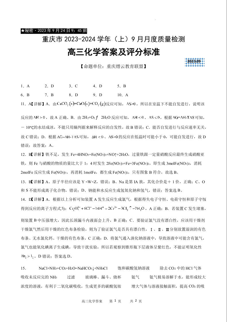重庆市缙云联盟2024届高三上学期9月联考化学答案
