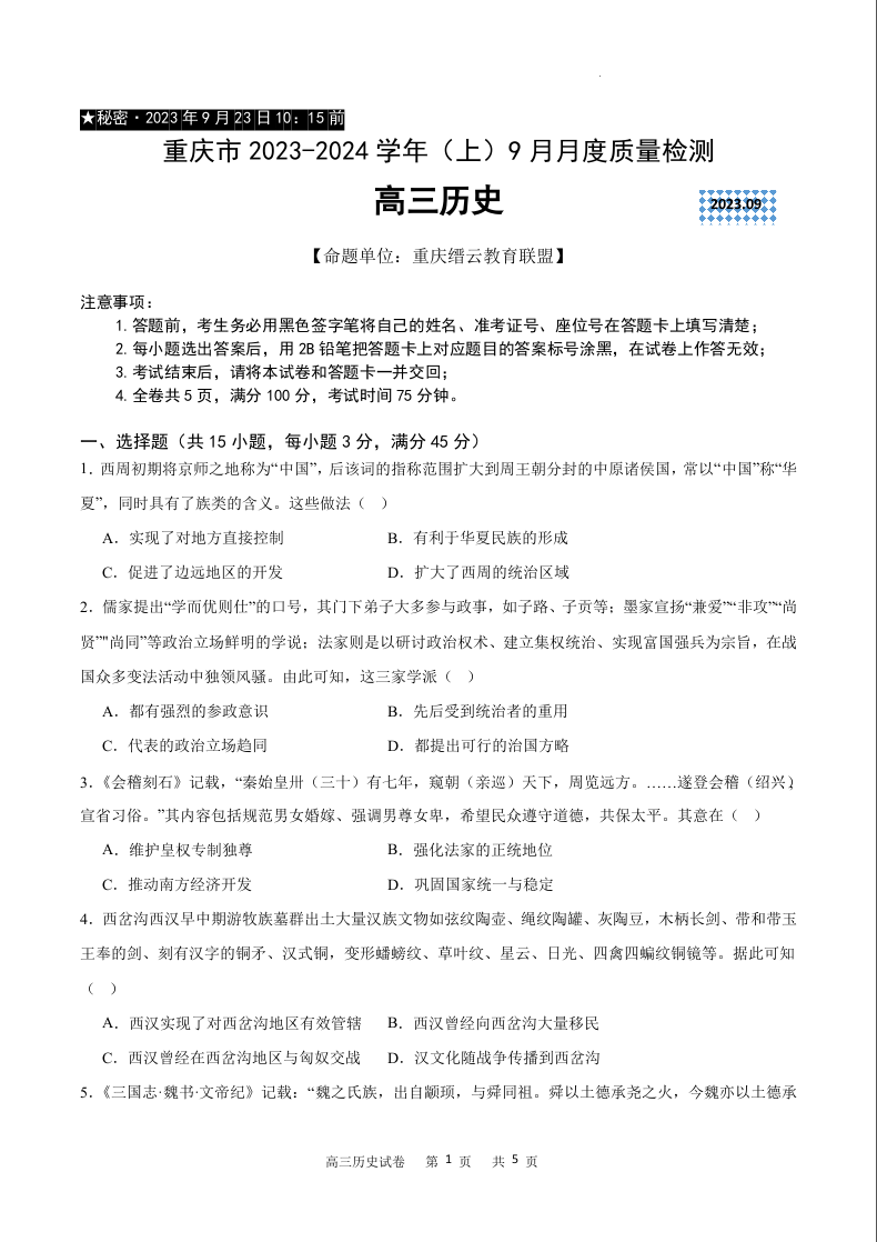 重庆市缙云联盟2024届高三上学期9月联考历史