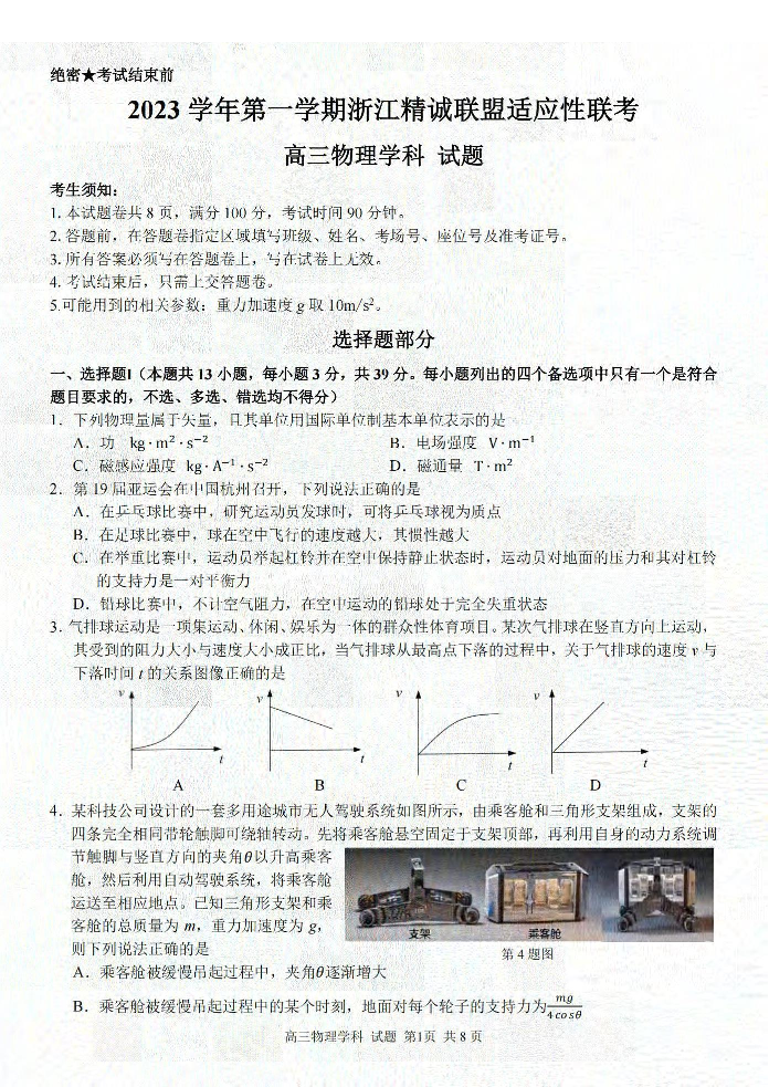 浙江省精诚联盟2024届高三上学期12月适应性联考物理
