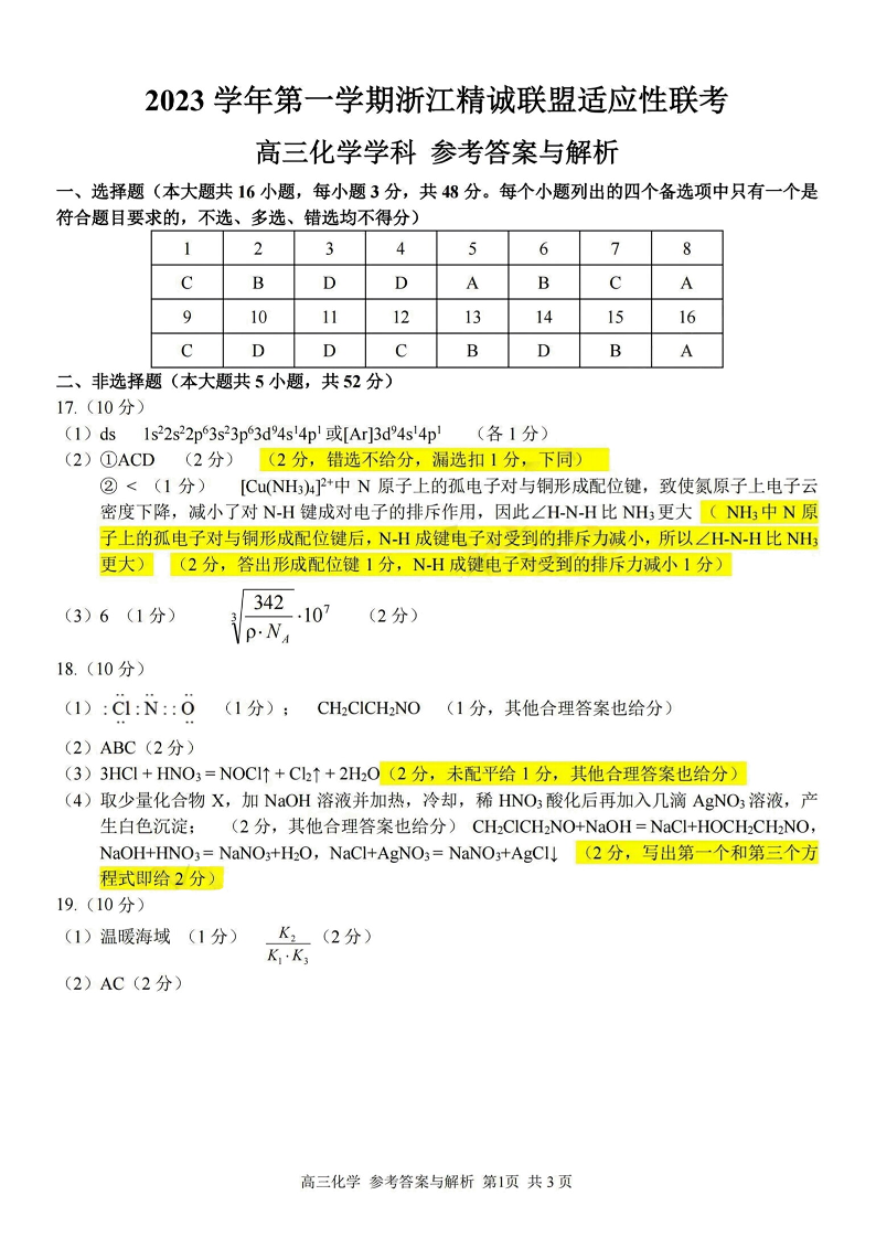 浙江省精诚联盟2024届高三上学期12月适应性联考化学答案