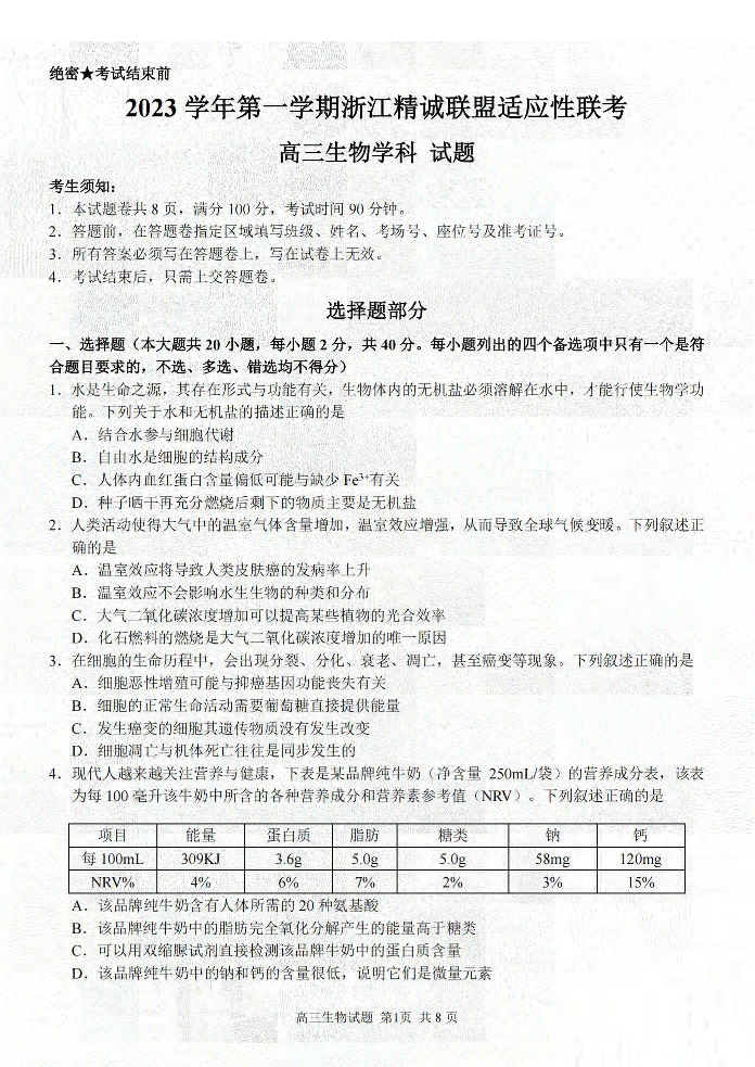 浙江省精诚联盟2024届高三上学期12月适应性联考生物