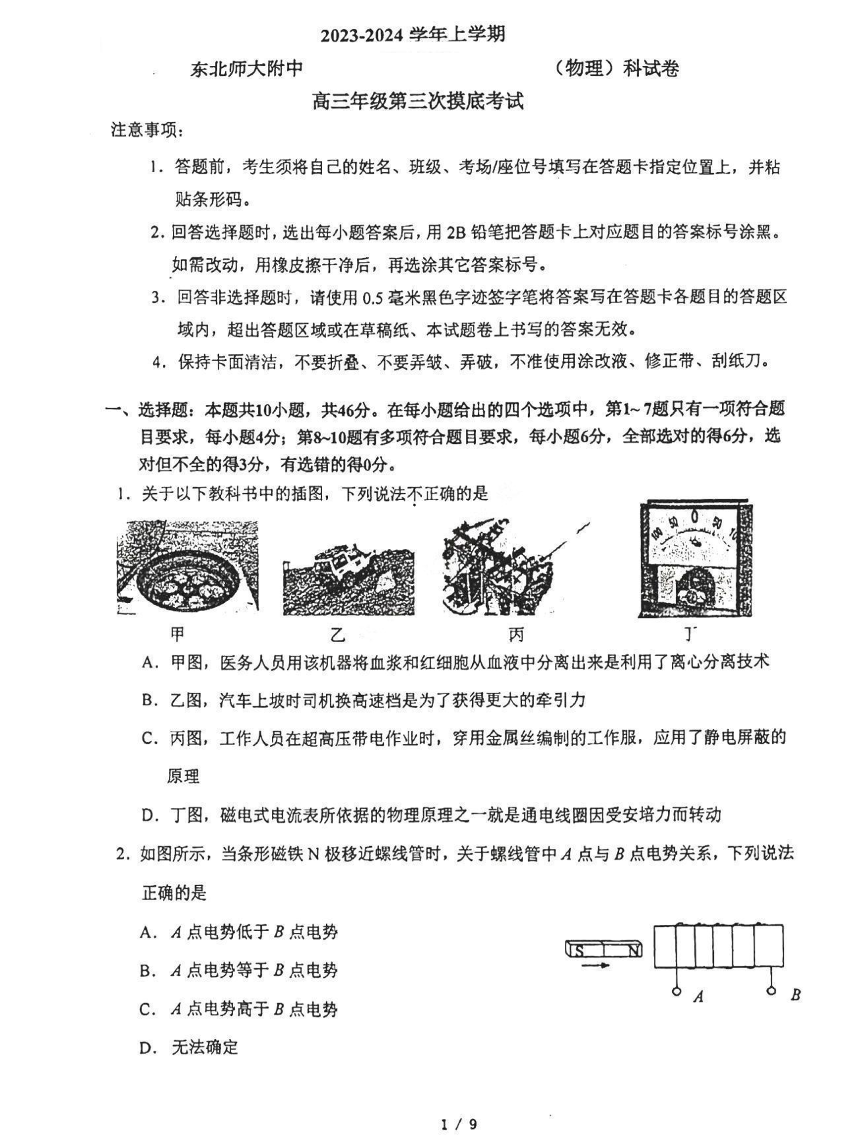 吉林省东北师范大学附属中学2024届高三上学期第三次摸底物理+答案