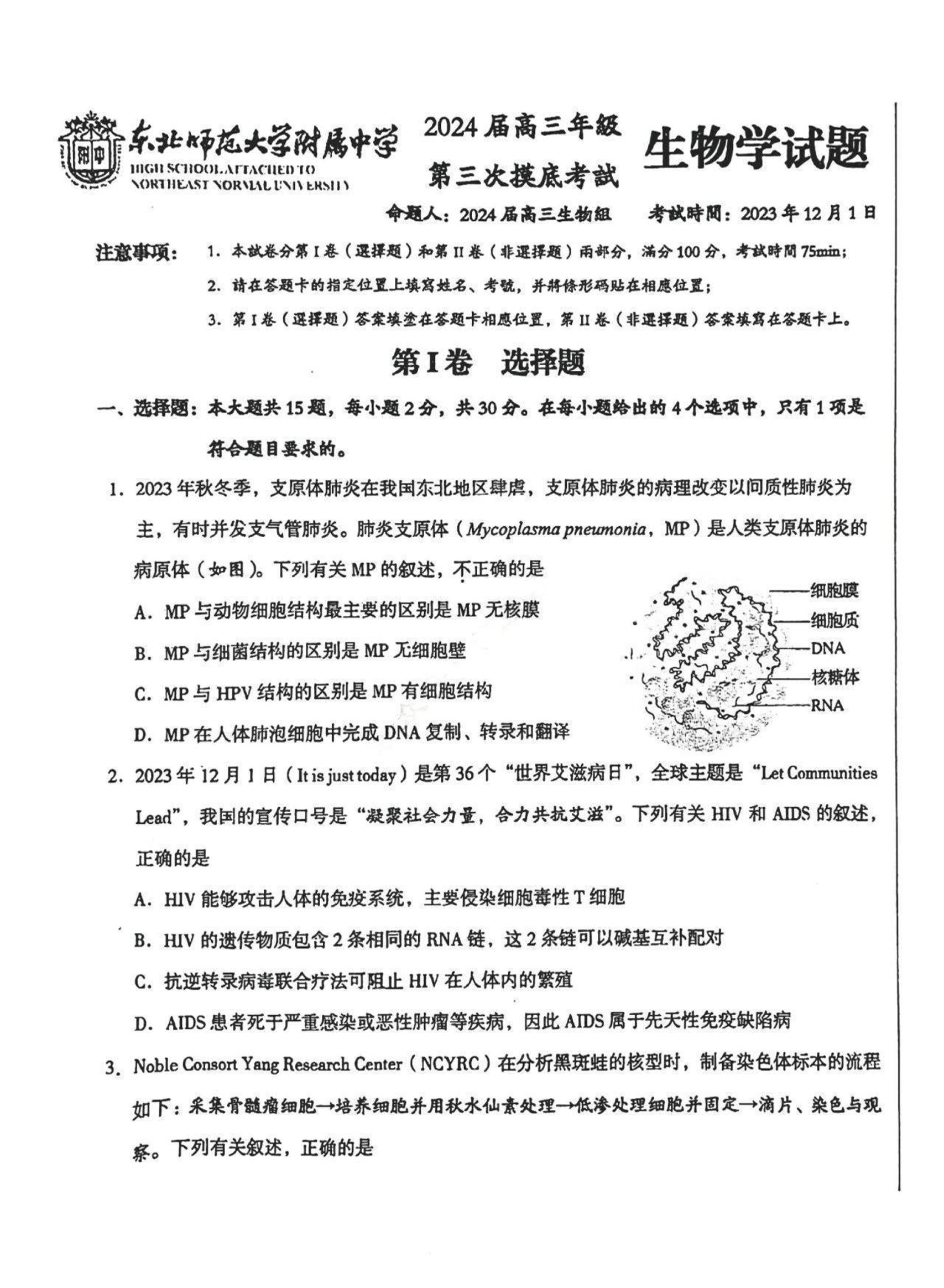 吉林省东北师范大学附属中学2024届高三上学期第三次摸底生物+答案